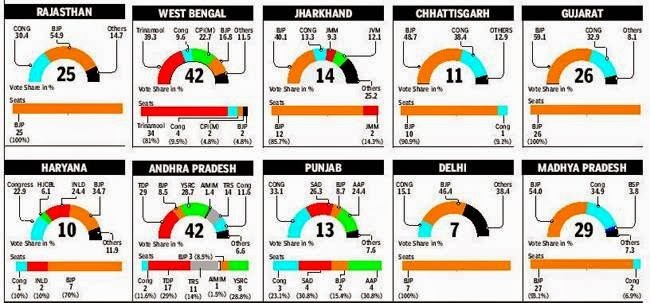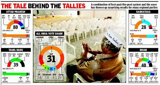 The losers got significant vote-share: BSP (Mayawati) got 20% in UP (zero seats), CPI(M) got 30% in Bengal (2 seats), Aam Admi Party got 33% in Delhi and 25% in Punjab (zero in Delhi but 4 in Punjab!!!), DMK got 27% in Tamil Nadu (zero). In Odisha Congress got 26% (zero) and BJP got 22% (1 seat).