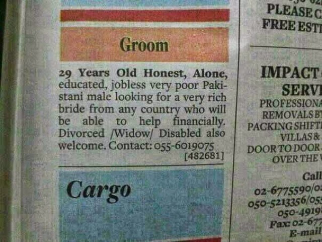 LOL! It looks like he is in UAE from the phone number. How can you be unemployed and stiill reside in UAE? Anyhow if he is a good looking Pak and has got some game, he can hook up with perhaps a rich divorced Emirati female. It happens every now and then. Especially if the Emiratis have Pak/Indian ancestry.