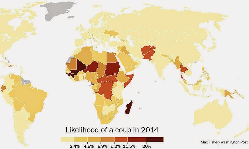 One more point of interest (for parochial Bongs): a look at the map above and we note the likelihood of Bangla herself experiencing a coup in 2014, along with sister nations Nepal, Burma, Pakistan and Afghanistan. It was a hundred years ago when the freedom fighter from Maharashtra, Gopal Krishna Gokhale noted: “what Bengal thinks today, India thinks tomorrow.” This dictum updated for the C21 may read as “what Bangla thinks today, South Asia (sans India) thinks tomorrow.” We speak in jest, of course.