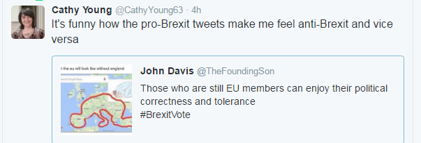 This is grimly amusing to watch. Yeah, that convergence with Eastern Europe really is coming whether you vote remain or leave, because EE’s catchup growth is intrinsically easier than Britain’s. (Well, I suppose you can unwittingly try to speed it up, as today. Prediction: not much will change in that direction either.) They won’t merely be markets, they’ll also make products and do telemedicine and whatnot. You can’t expect Brits to perpetually make more than Poles for no earthly reason, simply because they are Brits. This globalization genie isn’t going to be squeezed back into the bottle, and the Chinese aren’t going back to starving in farms. Oh, meanwhile it’s more than just econ, those lorry drivers really are going to have job trouble when automatic cars become safer than regular ones.