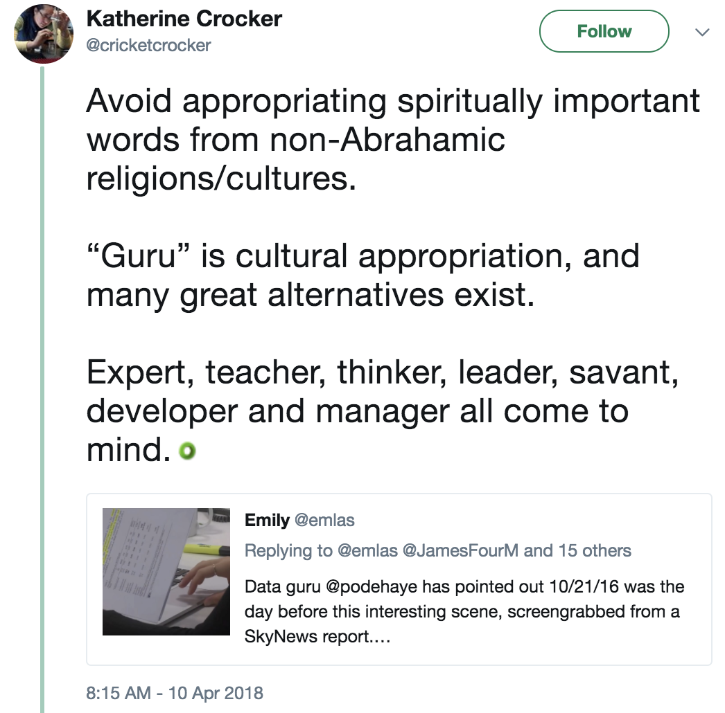 While I don’t myself believe in this cultural appropriation thingie one bit (many Sanskrit texts themselves use the word Guru also in the more secular sense), nevertheless, I, as a Hindu fundamentalist who is fed up of seeing so many Hindus and westerners speaking for Muslims, have to confess that it feels psychologically good/comforting to see this SJW purporting to speak for Dharmics.