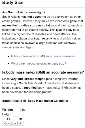 There is the caveat that muscle is heavier, so one shouldn’t take BMI literally, as opposed to seriously. You know if you have too much visceral fat, you don’t need to weight yourself. The phenomenon of brown guys with big bellies due to years of self-indulgence is a thing. And excess weight among South Asians who reach a certain affluence level seems a thing the world over.