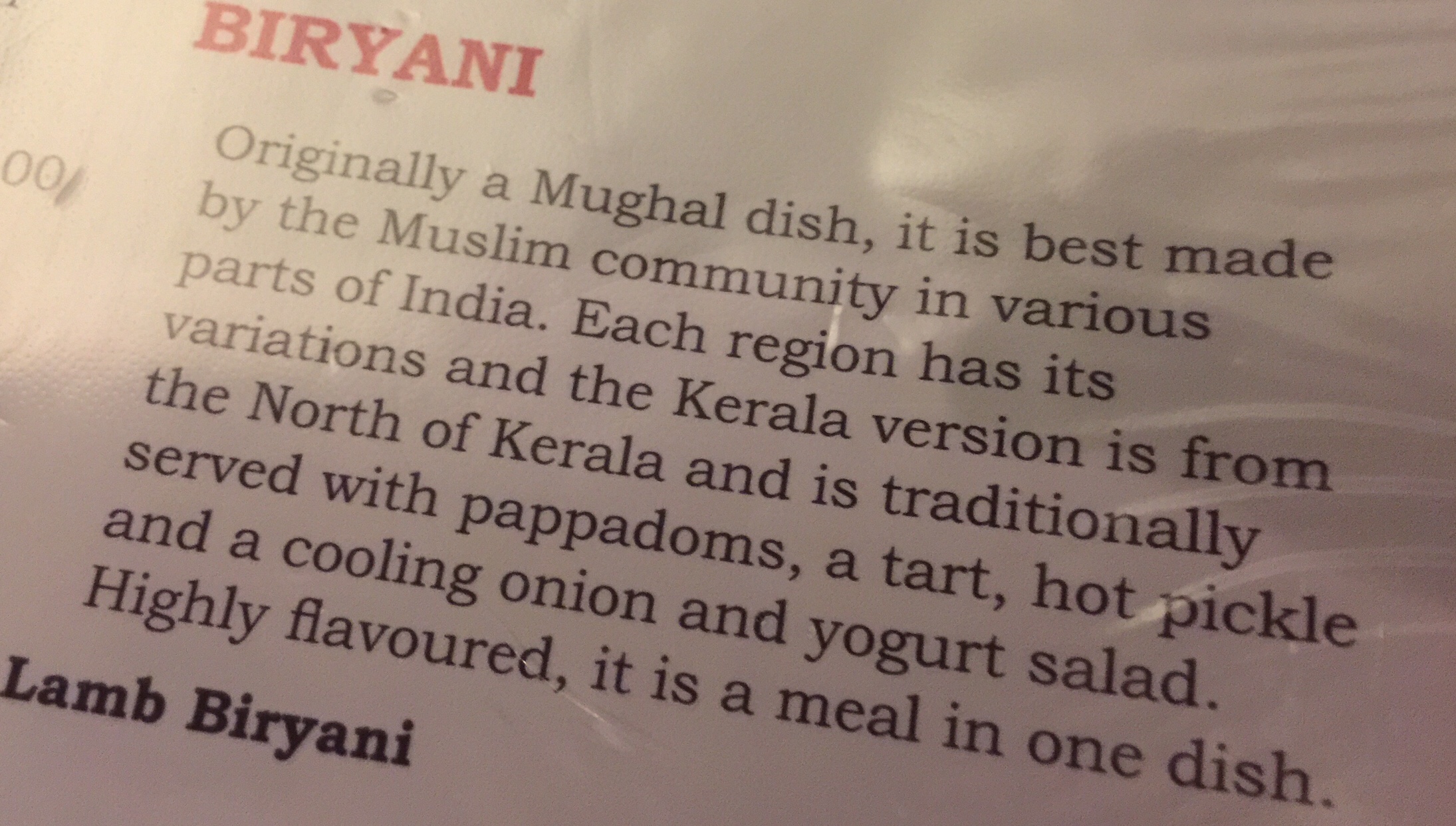 The taste of Biryani is miraculous. I can make vegetarian dishes but I have no idea how they get the Biryani tastes, except that they layer the rice after cooking. I suppose it is based on Persian rice dishes but I’ve not seen Persian cooking with such sophistication. My guess is that the Muslim culture in old India developed with the resources of the Mughal courts, the best poets, musicians and cooks. (To me, Pakistanis are like old Royals in exile, leaving an unfillable hole in Delhi culture) But I ate Biryani in Kerala where Malabar had the Moplas. A few years back they invented ‘headcloth Biryani’, it’s a whole subculture.