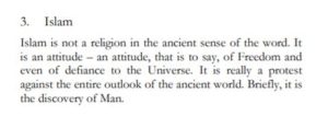 “Believe me, Europe today (due to its perverted ego) is the greatest hindrance in the way of man’s ethical advancement. The Muslim, on the other hand, is in possession of these ultimate ideas of the basis of a revelation, (…) which, speaking from the inmost depths of life, internalises its own apparent externality. With him the spiritual basis of life is a matter of conviction for which even the least enlightened man among us can easily lay down his life.”