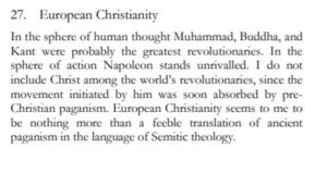 The books is interesting, especially if you are philosophically inclined towards the “spiritual” and the mystical; on the other hand, if you are somewhere on the “new atheist” spectrum then the book can only be of historical interest. Even those who are willing to entertain metaphysical speculation should be aware that this is not a systematic philosophical text. All the central claims of the book are simply asserted (there is rarely any detailed argument showing why they are correct) and the historical views are very early 20th century, with the ghosts of Spengler and countless lesser writers hovering in the background. Entire cultures and historical epochs are summed up in ex-cathedra pronouncements of the sort that were popular in that age but seem to have fallen out of favor since then. For example “the cultures of Asia, and in fact, of the whole ancient world failed because they approached reality exclusively from within and moved from within outwards. This procedure gave them theory without power, and on mere theory no durable civilization can be based”.