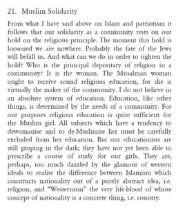 Historical references are cherry picked and whatever theory he is proposing is supported by quranic verses that other Muslims may nor may not interpret the way Iqbal does. Sometimes the cherry-picking stretches credulity and even fans may become a bit suspicious; for example, defending the unequal shares of men and women in Quranic inheritance law he says “From the inequality of their legal shares it must not be supposed that the rule assumes the superiority of males over females. Such an assumption would be contrary to the spirit of Islam. The Qur’an says: And for women are rights over men similar to those for men over women’ (2:228). This is rather disingenuous, because the quoted verse in context is not about equality at all, but specifically about the superiority of men over women. Here is Yusuf Ali’s translation of the entire verse: Divorced women shall wait concerning themselves for three monthly periods. Nor is it lawful for them to hide what Allah Hath created in their wombs, if they have faith in Allah and the Last Day. And their husbands have the better right to take them back in that period, if they wish for reconciliation. And women shall have rights similar to the rights against them, according to what is equitable; but men have a degree (of advantage) over them. And Allah is Exalted in Power, Wise.