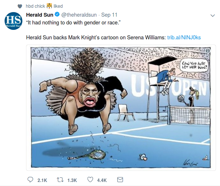It shows what the cartoonist George Knight really thinks of Serena. The racist & sexist muppet also drew Naomi Osaka as a blonde when she’s anything but!