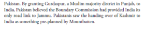 :– A work so well researched should not have basic factual wrong, as on page 23 where our brilliant author misses the point that parts of Gurdaspur district were awarded to India and not the whole Gurdaspur district as she fallaciously claims