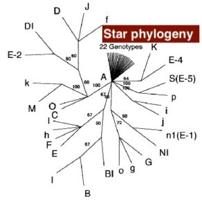 You can see in the figure that node “A” has given rise to a “star phylogeny.” A large number of individuals are one mutational step away from that genotype. A more normal phylogeny would produce a complex structured tree which accrues mutations across the various branches gradually.