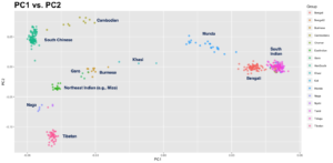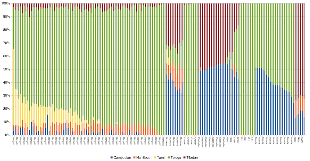 2) No idea why Bangladeshis are showing so much “South Chinese” signal in admixture. Perhaps it is artifactual, or, we’re missing some donor population? There is clearly some Munda admixture in a few individuals, but it doesn’t seem to be the dominant contributor of East Asian ancestry.