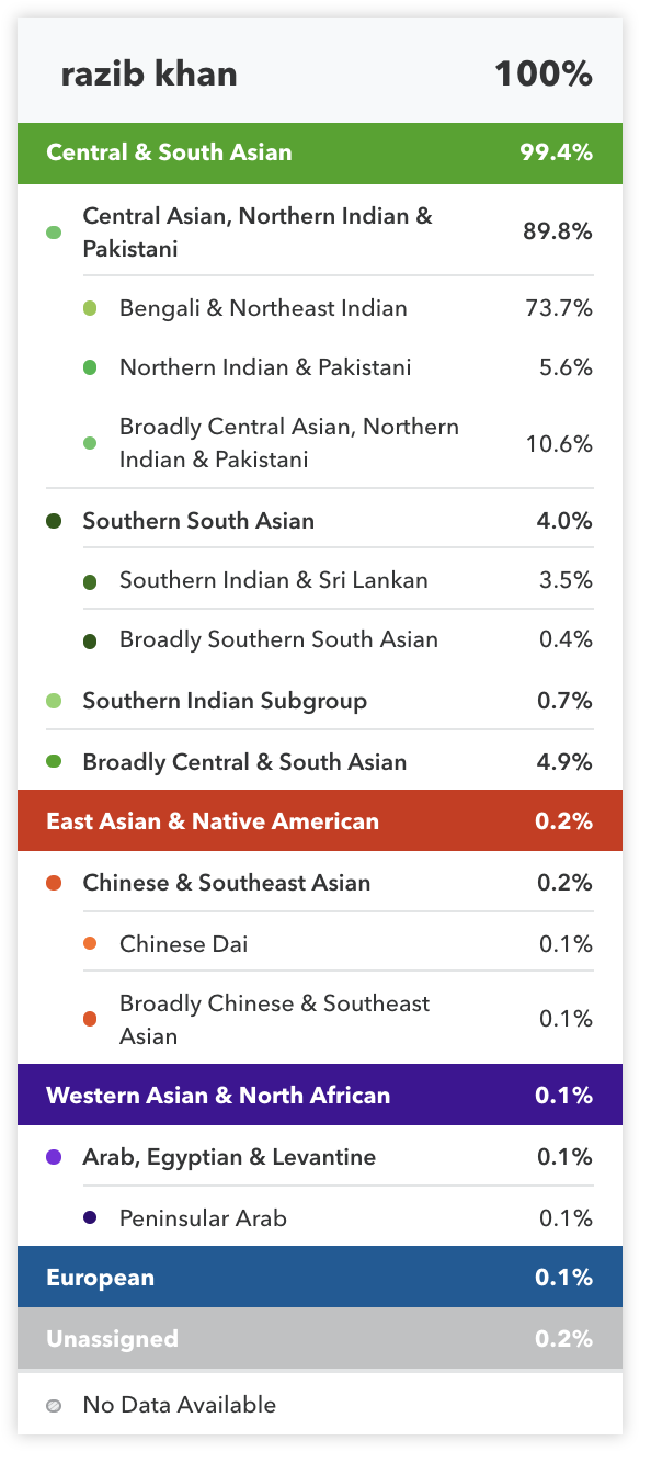 As Razib said on the podcast, these ethnic labels are quite misleading as they are not MECE. The current ethnic/regional “breakup” is a function of (among other things) the current sample set that 23andMe has. For example, Southern Indian Subgroup aka Southern Brahmins shows up for various folks because they have a large sample size of Southern Brahmins (due to their disproportionate representation among educated and tech forward Indians in the US). Once 23andMe has a sufficient number of Maharashtrians, Gujaratis and UPites we might see the high Bengali or Southern Subgroup stats go away for folks that are not truly of those ethnicities.