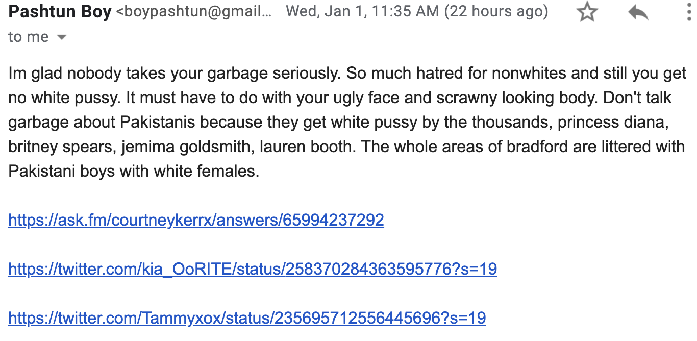 It sounds to me as a recent TTT (tough taqiyya talking) āmentholā (slang for – homo anonymous i.e. anonymous homo(ron), stalker with a mental condition), hidden behind three layers of pseudonyms who always chooses his special goat to be white.