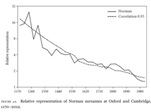 To me, the most striking element of Clark’s data is the persistence of Normans in the British elite. Though 0.30% of the British population at most, they were 16% of the student body at Oxbridge in the 12th-century. The proportion of Norman surnames at Oxbridge did not converge to the population proportion until the late 20th-century! This means it took nearly 1,000 years for Normans to regress (they are still over-represented in the British officer corps).