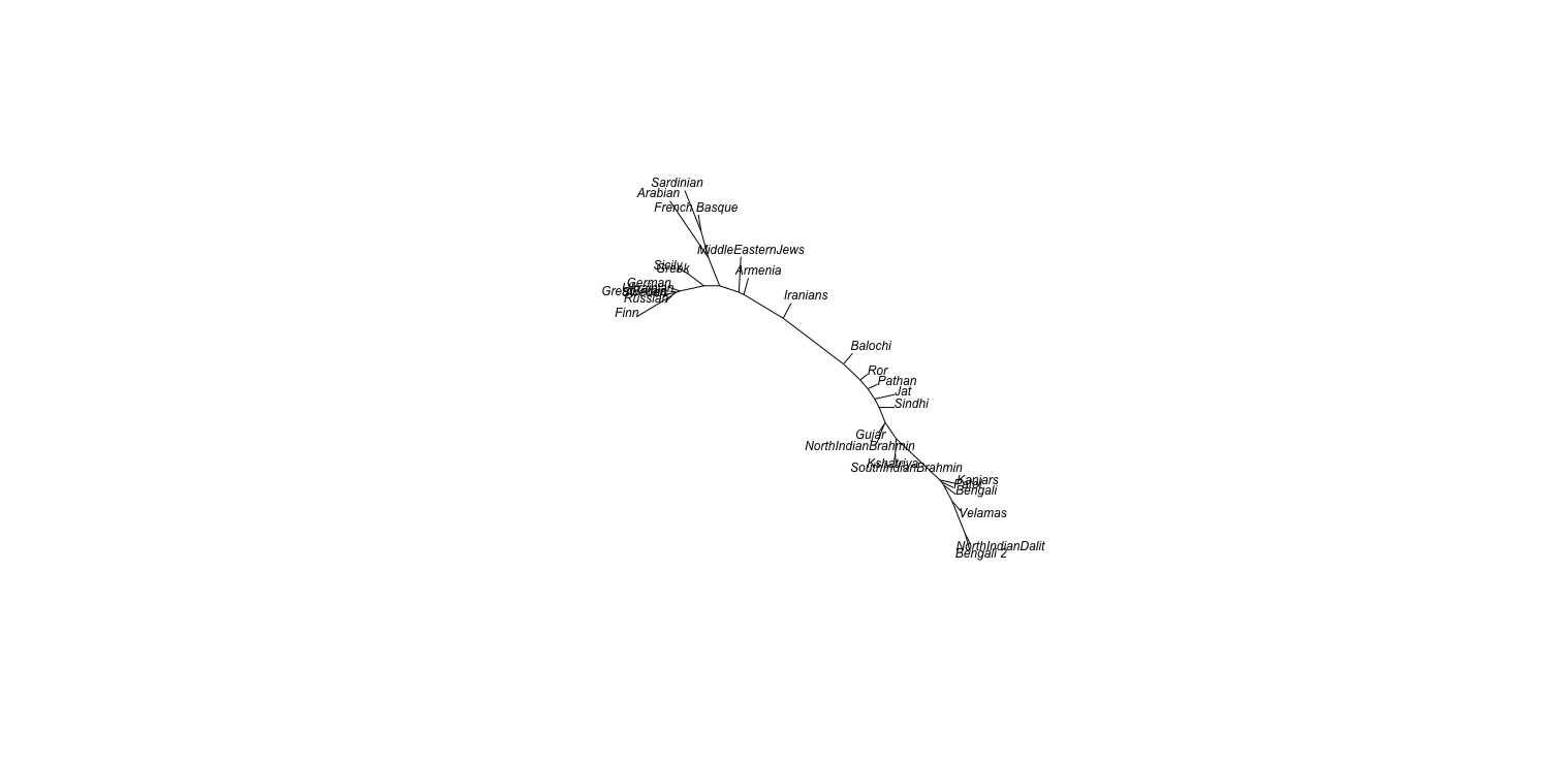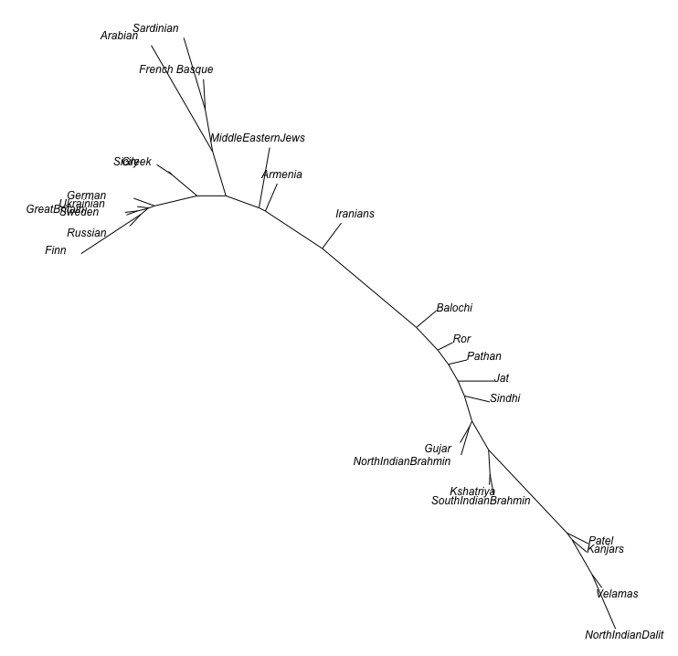 So stupid question time. Is the correct way to read the graph to measure the actual physical distance between the population labels? I.e. confirming (as I read in the reich book) that indeed south asians are far more distant from each other than europeans are from each other?