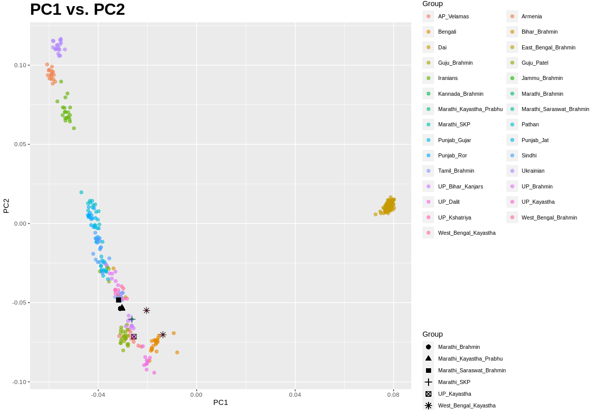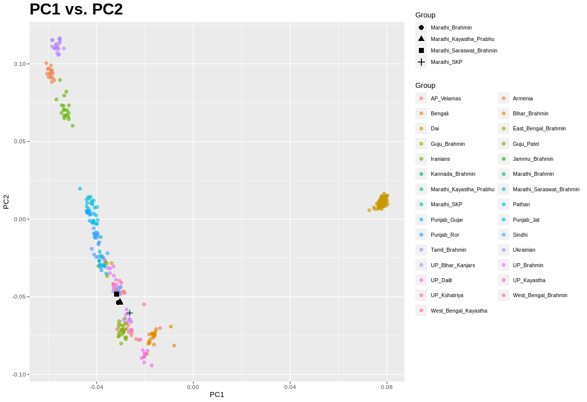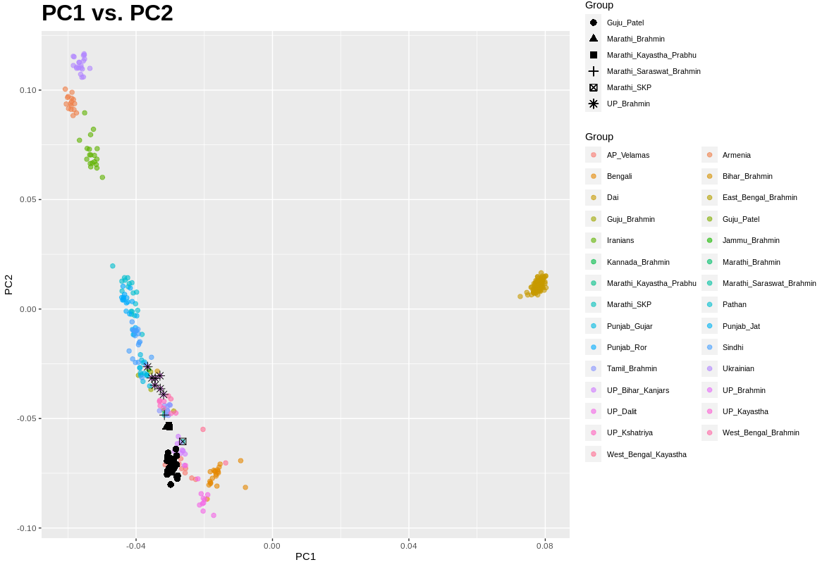 The PCA plots below should make it clear that the CKP is very close to the Maharashtra Brahmins I have in my samples. This is in contrast to the SKP, who are closer to Gujurati Patels.