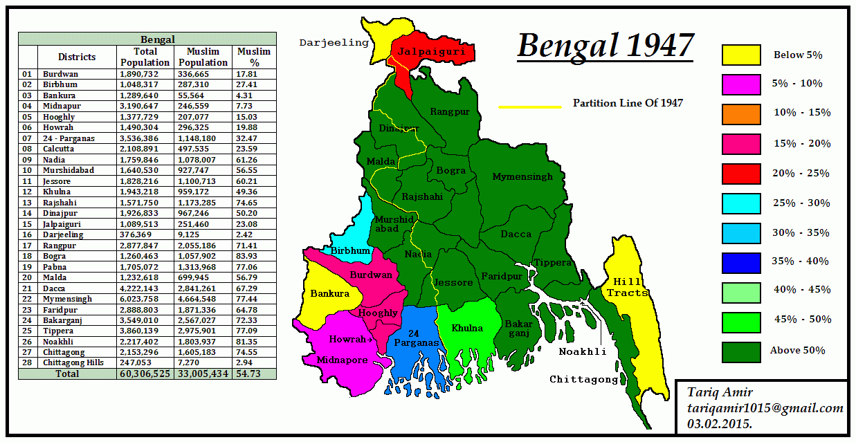 This brings us to Bengal and what is today Pakistan. These were the major Muslim majority regions of the Indian subcontinent that were clear in the 1871 census. Looking at the map the Muslim character of western Punjab and Sindh are totally comprehensible. But what is going on in Bengal?