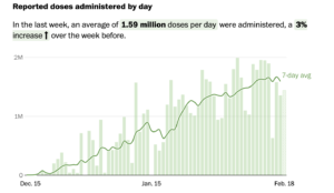 6. Vaccines. I consider the development of COVID vaccines a modern day miracle. The fastest that a vaccine had been previously prepared was close to three years. The severity of disease, mounting death rate and irresponsible behavior by the general public, made the timeline for introduction of a vaccine shorter than ever. Fortunately, the mRNA type platform vaccines had been in development for years and this was the right moment for them. The journey started in January 2020, when COVID genome was first shared by Chinese scientists and culminated in November/December 2020, when two major candidate vaccines was ready to be administered. Since mid-December, more than 73 million doses of either of these vaccines has been distributed in the US. This is a graphic from the Washington Post tracking vaccine distribution in the US: