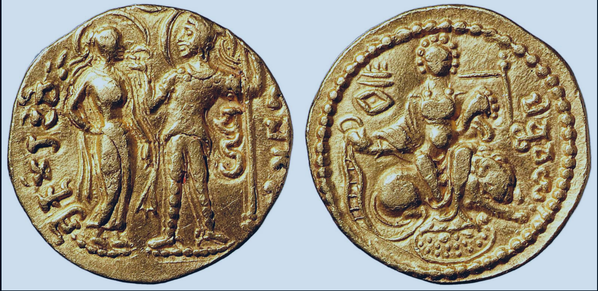Gold coin of Chandragupta I with his wife Kumaradevi