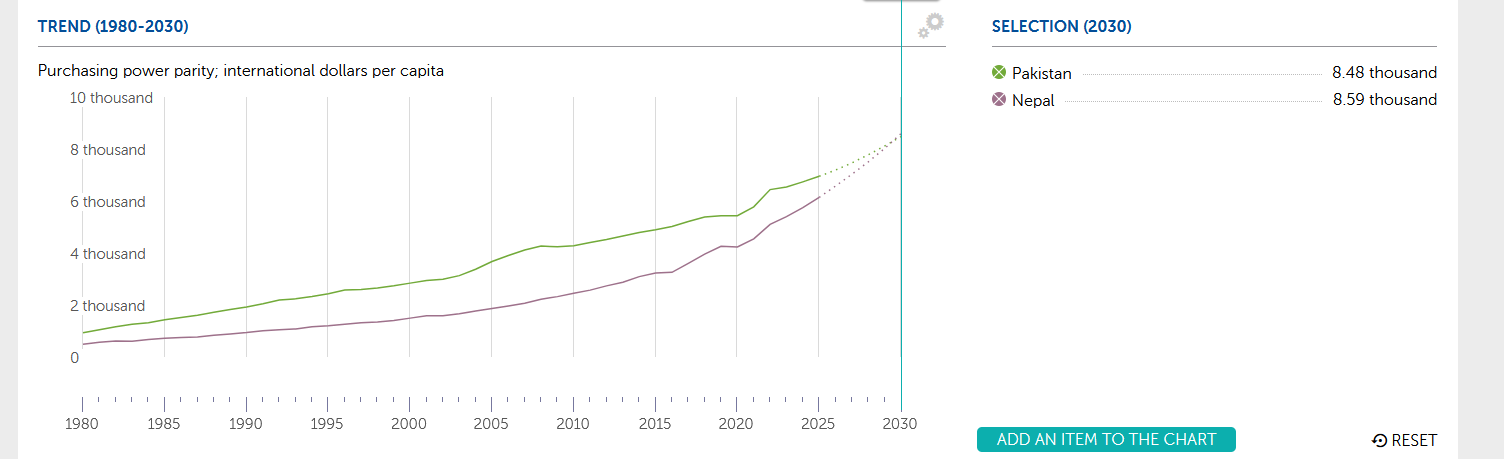 Thing is not only does Pakistan have the lowest HDI in the Indian subcontinent (only one in UN’s “low” HDI below 0.55. Everyone else is above 0.6), it will also have the lowest per capita income in 5 years, going below Nepal.