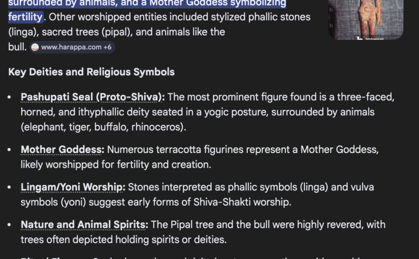 Look at what Mohenjo-daro actually gives us: the Pashupati Seal; three-faced, ithyphallic, seated in yogic posture, surrounded by elephant, tiger, buffalo, rhinoceros. Proto-Shiva. The Mother Goddess figurines. Linga and yoni stones. Pipal veneration. The sacred bull. Every single religious thread runs forward into the living Hindu tradition.