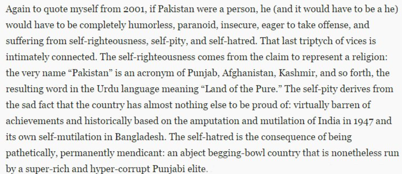 I think that there is something else going on though. A lot of Indians just cannot psychologically deal with the fact that their neighbor to the northwest is a strong and self-respecting Muslim-majority country.