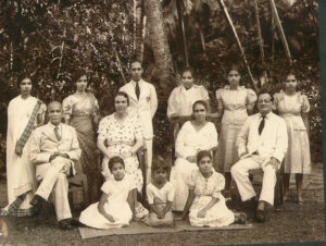 LR: Ms Anthin (Swedish Missionaries daughter), Sunethra neighbor and family friend, Sinhalese, AC Barr-Kumarakulasinghe (Jaffna Tamil), Peace Beebee (mother), Wilson Allegacone (fathers nephew, Tamil), Lal Liyanage (mothers nephew, Sinhalese)